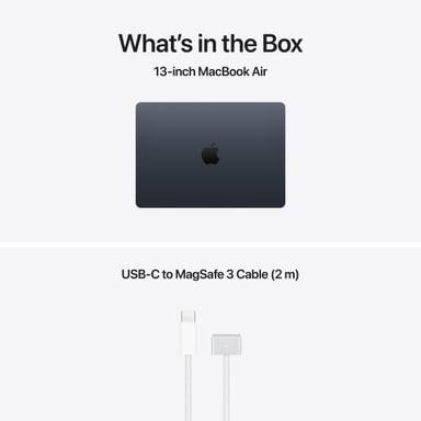 - STRØMFORSYNINGER – Bemærk: MacBook Air (13") leveres med et USB-C til MagSafe 3-opladerkabel, men der følger ingen strømforsyning med. For at oplade enheden skal du bruge en USB-C-strømforsyning eller en anden USB PD-strømkilde, der kan levere 30 W eller højere. Apple anbefaler at bruge Apple USB-C-strømforsyningen på 30 W til denne Mac for at få optimal opladning eller USB-C-strømforsyningen på 70 W for at udnytte funktionen til hurtig opladning (op til 50 % opladet på 30 minutter).6