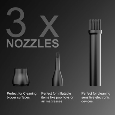 Med tre medfølgende dyser tilpasser NOS D800 sig forskellige opgaver. Den brede dyse er ideel til store områder, oppustningsdysen er perfekt til oppustelige genstande mens præcisionsdysen er velegnet til følsom elektronik.