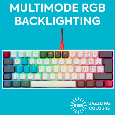 Design: Tastaturet passer godt på dit skrivebord takket være det minimalistiske design og kun 62 taster. Selv konstruktionen er designet med pladsbesparelse i tankerne: Tastaturet er kun 60% så stort som et almindeligt tastatur, hvilket gør det velegnet til at tage med på farten til f.eks. turneringer.