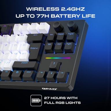 Dette trådløse QPAD Loop Model 3 tastatur er en alsidig og kraftfuld mulighed med mekaniske kontakter, der kan skiftes direkte, tri-mode-forbindelser, RGB-belysning, QPAD-berøringsbjælke, dobbelt lydknap og en batterilevetid på 27 timer.Læs mere om produktet