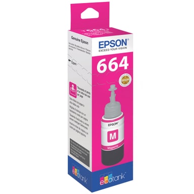 Denne Epson Ecotank T6643 udskiftningsblækflaske i magenta lader dig fylde magentablæk i din Epson Ecotank printer. Flasken indeholder 70 ml. magentafarvet blæk, hvilket er nok til cirka 6500 sider.Læs mere om produktet