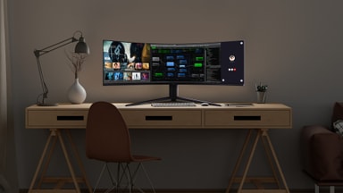 Få et ultrabredt synsfelt – dobbelt så bredt som en almindelig 16:9-skærm. Oplev en omsluttende visning, hvor flere vinduer vises på samme tid uden behov for konstant skift.
