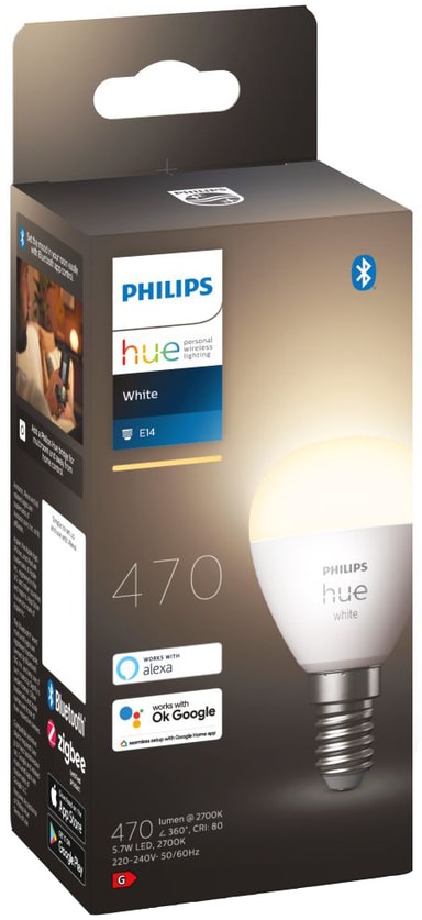 Philips Hue White 5,7W Luster E14 er en smart-løsning til små lamper og armaturer i dit hjem. Skab den rigtige stemning med et blødt hvidt lys. Betjen pæren nemt via Hue Bluetooth appen eller tilkøb Hue Bridge for at få flere funktioner.