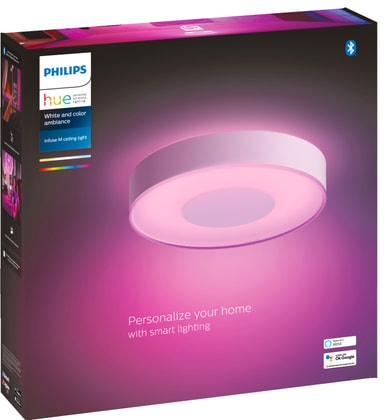 Med dette Philips Hue Infuse M loftslys får dit hjem et farverigt og atmosfærisk lys. Loftslyset har en RGB-farveskala, varmt-til-koldt hvidt lys, dæmpbar funktion og nem betjening via Phillips Hue-appen. For at få avancerede funktioner kan du tilkøbe Philips Hue bridge.