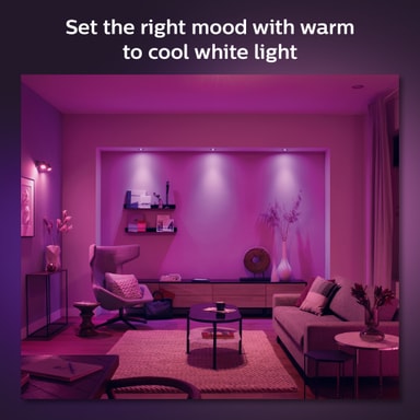 Dette forsænkede Philips Hue Centura spotlys 3x5,7W har den rigtige farve til enhver lejlighed. Med 16 millioner farver er der masser af muligheder for at eksperimentere og justere farverne alt efter dine daglige aktiviteter og dit humør. Indstil farven, intensiteten eller dæmp lyset via din smartphone eller din Hue Bridge, så du får endnu flere muligheder for at tage styringen over din belysning.