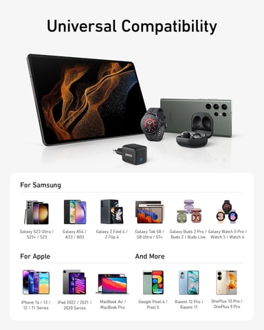 Anker 313 USB-C 45W Ace Oplader tilbyder ultra-hurtig opladning med op til 45 W, hvilket gør det muligt at oplade en Samsung Galaxy S23 Ultra helt på mindre end en time. Perfekt til at oplade dine enheder hurtigt og sikkert. Udstyret med 10 sikkerhedsfunktioner, herunder kortslutningsbeskyttelse, overspændingsbeskyttelse og temperaturkontrol, for at beskytte dig og dine enheder.Specifikationer: