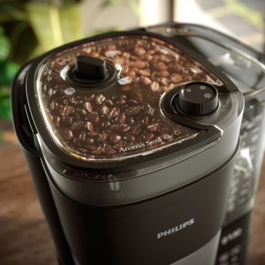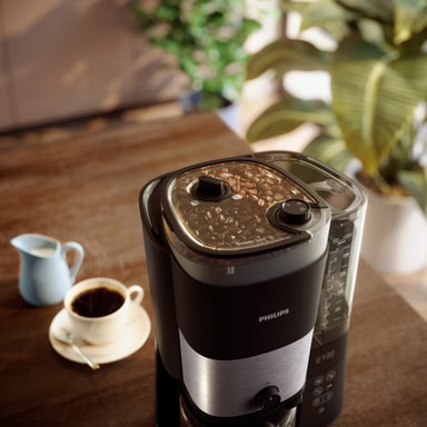 Philips Alt-i-én Brew Dryp kaffemaskinen HD7900/01 med dobbelt bønnebeholder og drypstop maler frisk, doserer perfekt til kop eller kande, har 10-kops aftagelig tank, auto-sluk, og brygger både varm og iskaffe.Læs mere om produktet