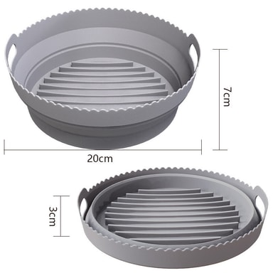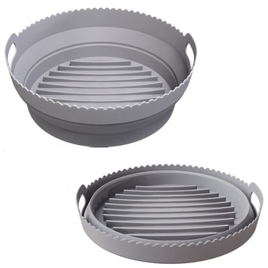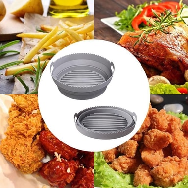 Rund form af fødevaregodkendt silikone. Den passer perfekt ind i frituregryden og forhindrer klistrede og fastbrændte madrester i din Air Fryer. Beholderen kan genbruges og kan vaskes i opvaskemaskine. Den hævede kant holder maden på plads samt fanger krummer og overskydende fedt. Formen kan komprimeres, så den fylder mindre, når den ikke er i brug.