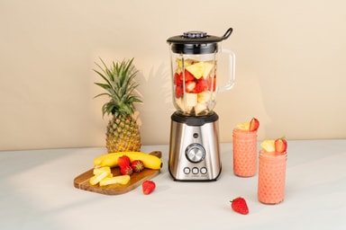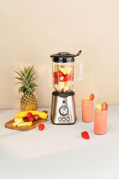 1000-watt blenderen har en 1,5-liters glasskål, rummelig nok til at blande frosne bær, grøntsager, nødder, frugt og isterninger til smoothies og puréer.