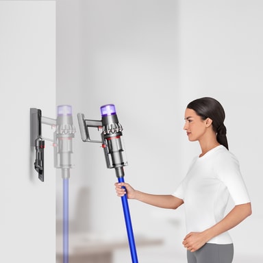 Støvsugeren kommer med en vægmonteret dock til opbevaring og opladning, som ikke optager gulvplads.
