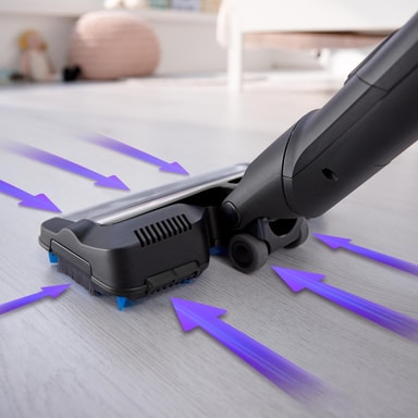 PowerBlade motoren er konstrueret til høj luftstrøm (>1.000 L/min), hvilket giver 360° sugning ved mundstykket. Dette sikrer grundig rengøring ved at opfange støv og snavs fra alle vinkler, hvilket gør din rengøring mere effektiv. 360° sugemundstykket opsamler hurtigt støv og snavs med hvert strøg, selv når du bevæger dig baglæns eller langs kanter, så hver bevægelse er effektiv.