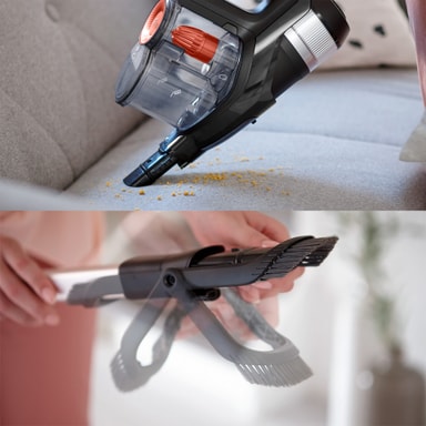 Monter og afmonter tilbehør med blot et klik. Børstetilbehøret er indbygget i røret, så det altid er lige ved hånden, når du har brug for det.