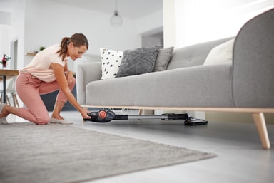Den topplacerede støvbeholder gør det muligt at nå lavere vinkler og ligge fladt på gulvet. Dette gør den perfekt til rengøring under lave møbler.