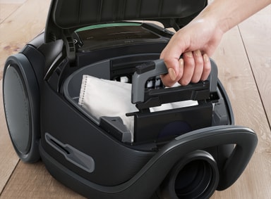 Optimeret luftstrøm og s-posen Ultra Long Performance sikrer en høj ydeevne af apparatet. Med den store s-pose på 5 l behøver du ikke at bekymre dig om rodet udskiftning af posen, da den lukker tæt for en ren og kontaktfri bortskaffelse.