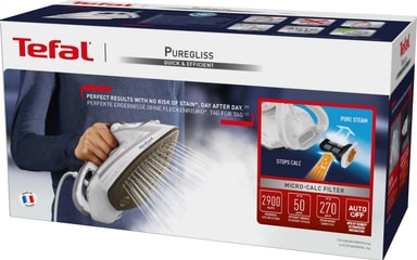 Tefal Puregliss-strygejernet FV8043E0's 50 g/min dampeffekt og 280 g/min dampskud vil fjerne krøller fra dit tøj på ingen tid. Micro Calc-filteret og Durilium AirGlide AutoClean-teknologien gør processen nem og pletfri.Læs mere om produktet