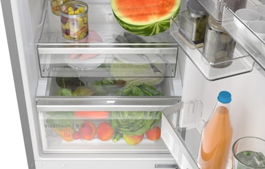 Det rummelige VitaFresh XXL <0 °C> -system er den perfekte opbevaringsløsning til dine friske råvarer. Systemet sikrer automatisk, at kød og frisk fisk opbevares ved lavere temperaturer, og den klimakontrollerede skuffe sørger for, at dine frugter og grøntsager forbliver friske i længere tid.