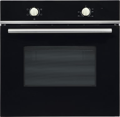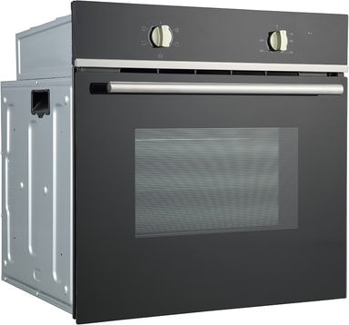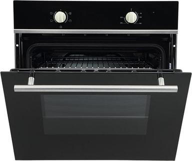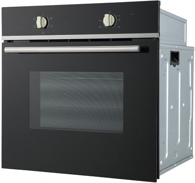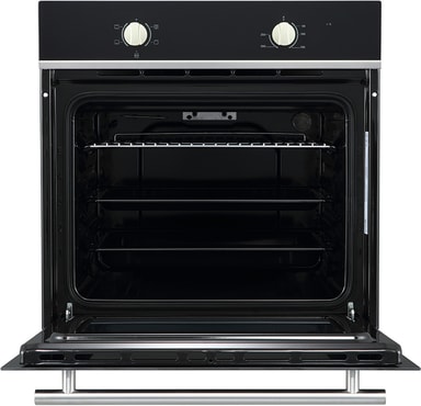 Ovnen har et elegant sort design, der passer ind i ethvert køkken. Derudover er den udstyret med en knap, der gør det nemt at styre de ønskede indstillinger.