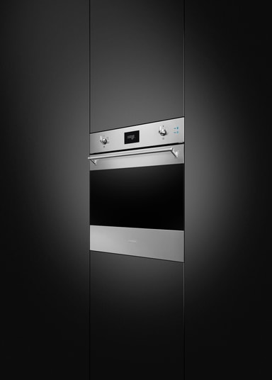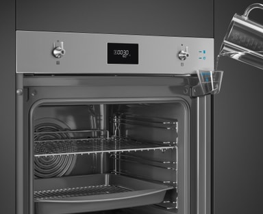 Ovnen er nem at rengøremed Smegs damprengøringsteknologi. Hæld lidt vand i ovnen, tænd for rengøringsprogrammet, og tør derefter det resterende snavs af med en klud. Så nemt er det.
