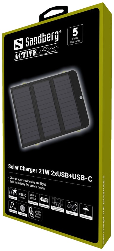 Oplad nemt dine enheder på dine vandreture med Sandberg Solar 3-panel opladeren med powerbank. Det foldbare solcellepanel har et design med 3 paneler og et indbygget 10.000 mAh batteri. Fastgør panelet på din rygsæk, anbring det på dit telt eller placer det på et bord, og oplad dine enheder via USB-C-porten og de to USB-A-porte. Når du ønsker at oplade powerbanken, kan du bruge enten en MicroUSB- eller USB-C-porten med understøttelse af strømgennemgang, og på den måde oplade både batteriet og din enhed. Derudover tilbyder panelet kortslutnings- og overspændingsbeskyttelse og vandtæthed, så du kan oplade under alle slags vejrforhold.