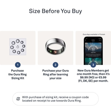 Oura-ringen følger ikke standardstørrelser, så det er afgørende at finde den helt rette pasform for en optimal brugsoplevelse. Takket være størrelsesmålingssættet kan du finde den rigtige størrelse ved dig, ved køb af sættet modtager du også et gavekort, som du kan bruge til at købe din Oura-ring.