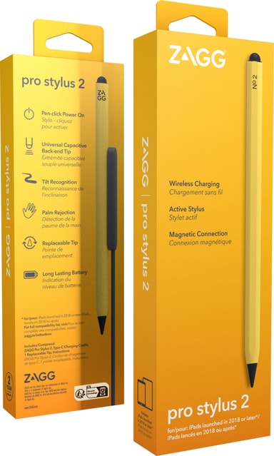 Denne Zagg Pro Stylus 2 tabletstylusen er fuld af fantastiske funktioner. Hældningsgenkendelse og håndfladeafvisning, trådløs opladning, Dual-tip, 6,5 timers batteriliv, og så meget mere. Gør din iPad til en notesbog eller skitsebog med bare et klik.Læs mere om produktet
