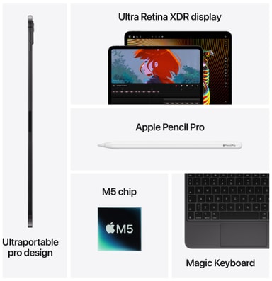 iPad Pro. Bygget til Apple Intelligence.1 iPad Pro drives af Apple M5-chippen og leverer en enestående ydeevne, som får både arbejdsopgaver og komplekse AI-processer til at glide let og ubesværet. Med en imponerende Ultra Retina XDR-skærm, superhurtig Wi-Fi 7,2 Neural Accelerators til AI-beregninger og et redesignet iPadOS er der intet loft over, hvad du kan udrette. Og i kombination med Apple Pencil Pro og Magic Keyboard til iPad Pro har du nærmest ubegrænsede muligheder for at arbejde både produktivt og kreativt.