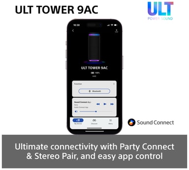 Party Connect giver dig mulighed for trådløst at forbinde op til 100 kompatible Sony-højttalere via Bluetooth for en endnu større lydoplevelse. Hvis du har en ekstra ULT Tower 9AC-højttaler, kan du bruge Stereo Pair til at skabe et kraftfuldt venstre-højre stereoopsætning for en mere omsluttende lyd.