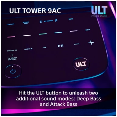 ULT Tower 9AC har to kraftfulde ULT-lydtilstande, der aktiveres med ULT-knappen. Deep Bass forstærker de lave frekvenser for en rig, resonerende dybde, mens Attack Bass øger lydtrykket for ekstra energi, volumen og impact.