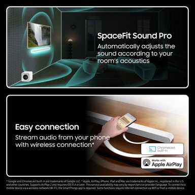 Storslåede lydoplevelser i et stilrent design. Modeller med Dolby Atmos skaber et tredimensionelt lydbillede, og takket være teknologien Q-Symphony kan Soundbar'en samarbejde med højttalerne i et kompatibelt Samsung TV om at skabe en mere fuldstændig oplevelse. De indbyggede højttalerenheder dækker hele frekvensområdet og genererer klar og fyldig lyd.