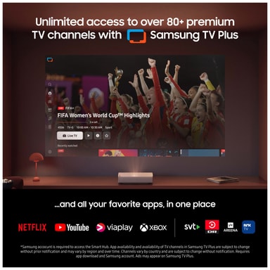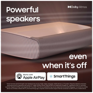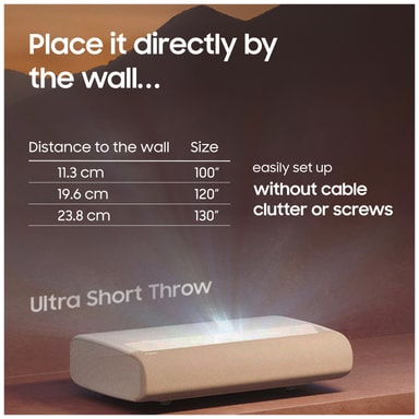 Fortab dig i den fordybende video og lyd fra Samsung LPU9D The Premiere Smart 4K UHD laserprojektoren med lysstærkt billede i høj opløsning, Ultra Short Throw-projektion, Smart TV-oplevelse og fantastiske spilfunktioner.Læs mere om produktet