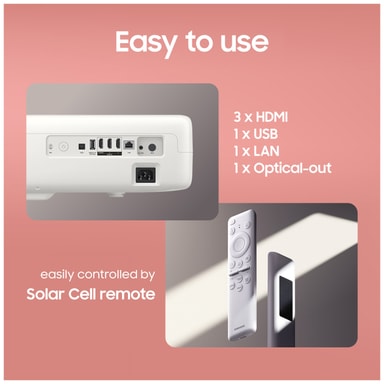 Samsung LPU9D Premiere Smart 4K UHD laserprojektoren leverer ikke bare fantastisk billed- og lydkvalitet, men også en lang række praktiske funktioner, der gør den til en fornøjelse at bruge. Du skal blot placere denne elegante, minimalistiske projektor med førsteklasses stoffinish tæt på en væg, tilslutte den og nyde film og spil i knivskarpe billeder med optimerede farver, der popper op, selv når den er tændt i dagslys.