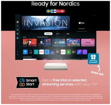Med Premiere får du de smarte tjenester, der er fælles for Samsung TV'er som Samsung TV Plus, Gaming Hub, SmartThings og stemmestyring. Nyd tusindvis af gratis film og administrer dine smarte enheder med den største bekvemmelighed.