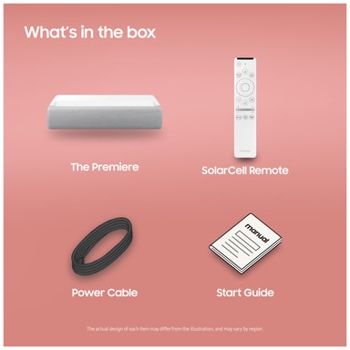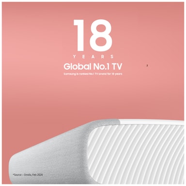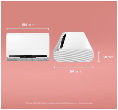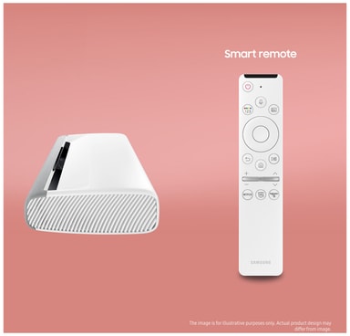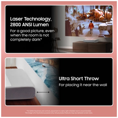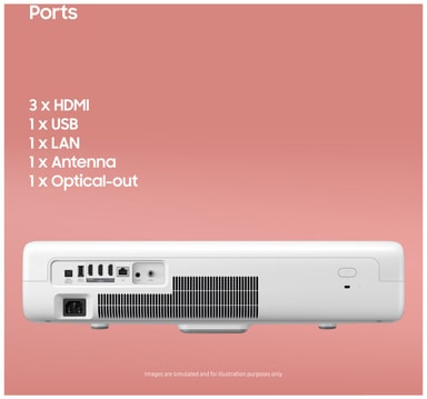Højtydende laserprojektor, der leverer lyse billeder med høj opløsning i op til 120”med Samsung Smart Hub og en bred vifte af apps og tjenester.