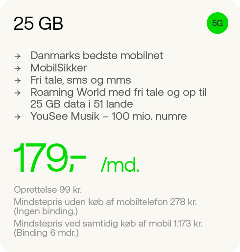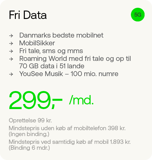 Alle priser gælder i DK, dog ikke trafik til udland og særtjenester. Bruger du mere data end de inkluderede GB/måned, sættes hastigheden ned til 1 Mbit/s. Abonnementerne gælder kun privatkunder og forbeholder binding i 6 mdr. Med Roaming World kan du, afhængig af abonnement, bruge op til 70 GB data i 51 lande, dog aldrig mere data, end du har med i dit abonnement. Se hvilke lande og hvad du bliver opkrævet for data herudover, på yousee.dk/roaming. Priser på opkald til udlandet fra DK finder du på yousee.dk/udlandspriser. Samlefordelen dobbelt data er ikke muligt ved Fri Data-mobilabonnement. Der opkræves et betalingsgebyr, når der betales med andet end Automatisk kortbetaling eller MobilePay. Betalingsgebyret er 9,75 kr./regning ved betaling via Betalingsservice og 49 kr./regning ved Manuel betaling.
