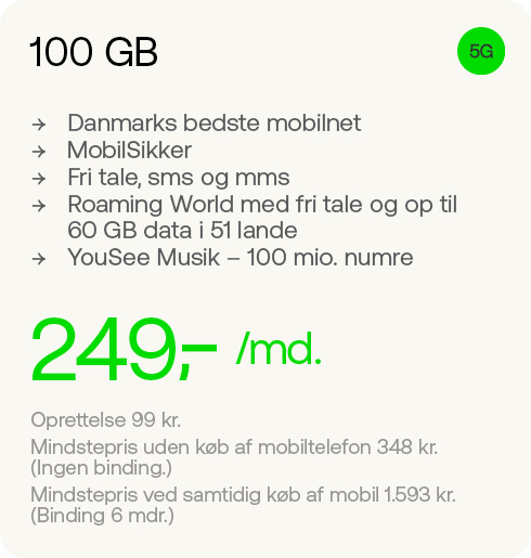 Med et mobilabonnement fra YouSee er du på Danmarks bedste mobilnet. Det betyder, at du kan opleve Danmarks hurtigste og mest fejlfrie mobilnet på et landsdækkende 5G-mobilnet med 99,7% adgang til 5G. Danmarks bedste mobilnet leveres af TDC NET og er målt på mobiloplevelsen af Teknologisk Institut. Læs rapporten fra Teknologisk Institut på yousee.dk/5g