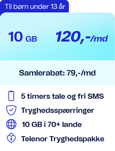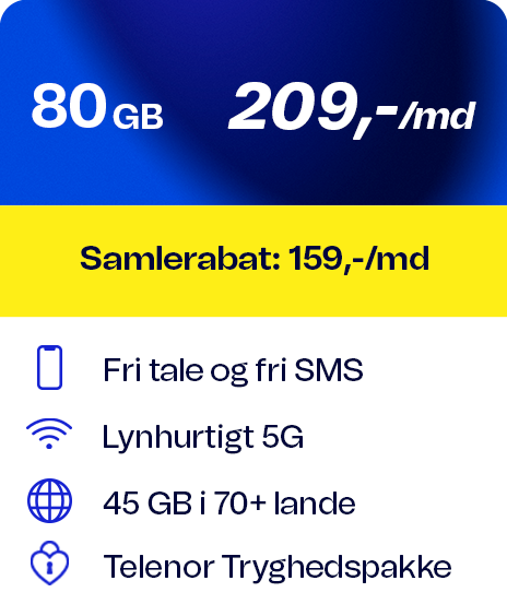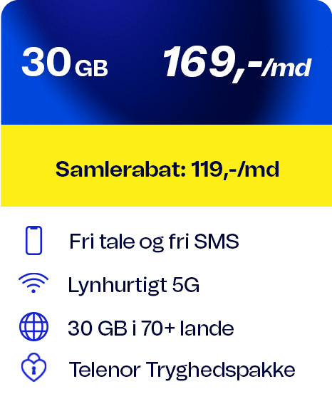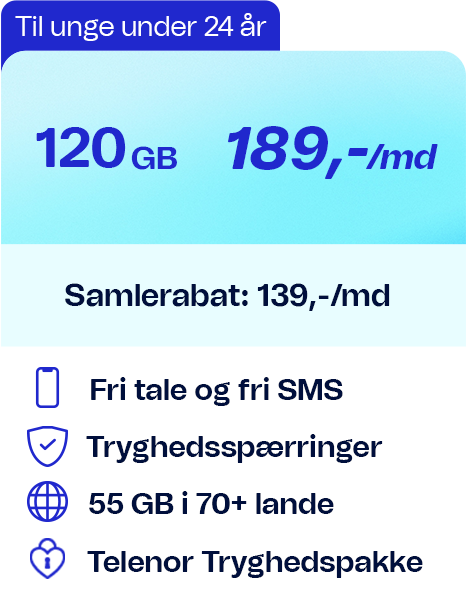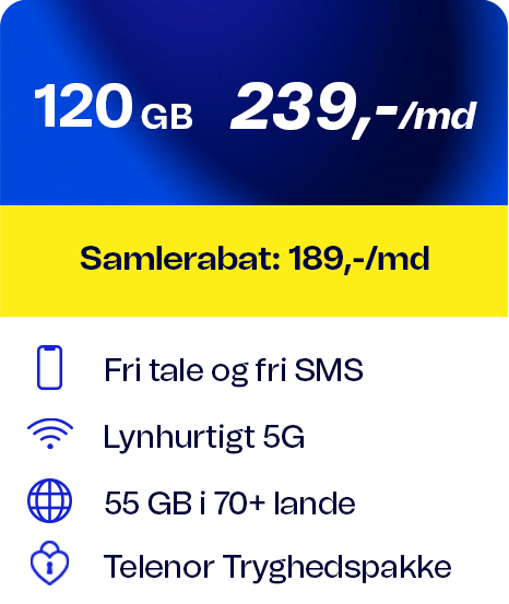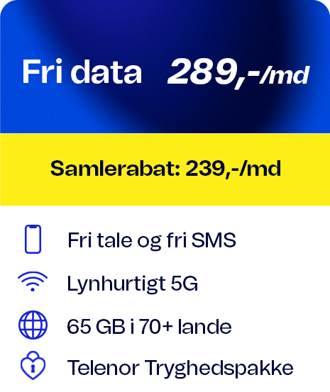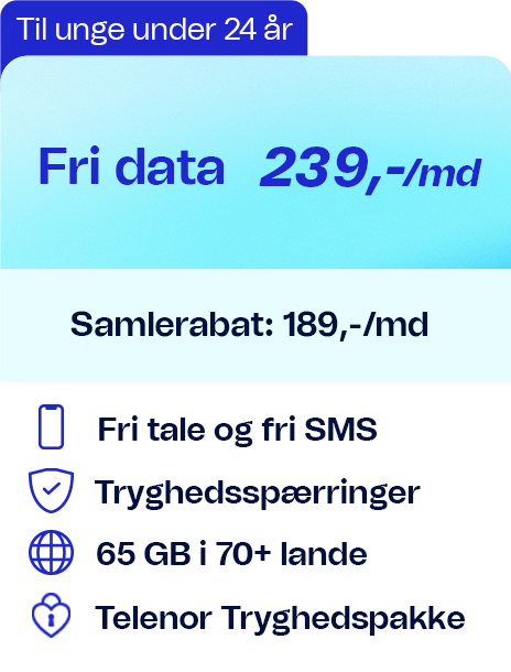 Alle priser gælder i DK, dog ikke trafik til udland og særtjenester. Bruger du mere data end de inkluderede GB per regningsperiode sættes hastigheden ned til 64/64 Kbit/s. Abonnementerne gælder kun privatkunder, og der er 6 mdr. binding ved samtidig køb af mobiltelefon. For dækning og priser i udlandet se telenor.dk/roaming.