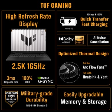 TUF Gaming A16 tilbyder 1 TB PCIe Gen 4-lagerplads, perfekt til dem med store spilbiblioteker. Med 16 GB højtydende DDR5-hukommelse kan den nemt håndtere alt fra multitasking til krævende spil. Det bedste af det hele er, at både lagerplads og hukommelse er fuldt tilgængelige og kan opgraderes, hvilket giver dig fleksibilitet og fremtidssikrer dine behov.