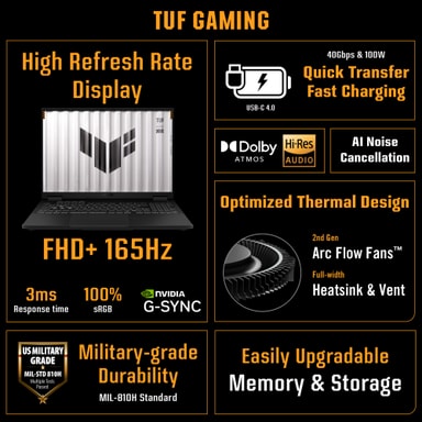 TUF Gaming F16 tilbyder 1 TB PCIe Gen 4-lagerplads, perfekt til dem med store spilbiblioteker. Med 32 GB højtydende DDR5-hukommelse kan den nemt håndtere alt fra multitasking til krævende spil. Det bedste af det hele er, at både lagerplads og hukommelse er fuldt tilgængelige og kan opgraderes, hvilket giver dig fleksibilitet og fremtidssikrer dine behov.