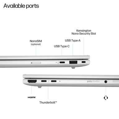 HP Wolf Security giver konstant beskyttelse på hardwareniveau. Den bærbare inkluderer en fingeraftrykslæser og ansigtsgenkendelse via IR-kameraet til sikker biometrisk godkendelse. Trusted Platform Module (TPM) 2.0 tilbyder datakryptering, mens multifaktorgodkendelse tilføjer et ekstra sikkerhedslag. Kabellåsåbningen giver mulighed for fysisk sikkerhed i delte rum.