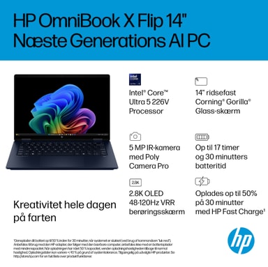 Den tynde og lette HP OmniBook X Flip 14 Next Gen AI-PC er skabt til mobil kreativitet. Med flere tilstande kan du arbejde og underholde dig fra enhver vinkel, mens den 2.8K OLED-skærm leverer levende farver og dyb kontrast i alle visninger. En AI-drevet processor og et hurtigt opladende batteri med strøm til hele dagen giver dig den hastighed, ydeevne og udholdenhed, du har brug for – uanset hvor du befinder dig.