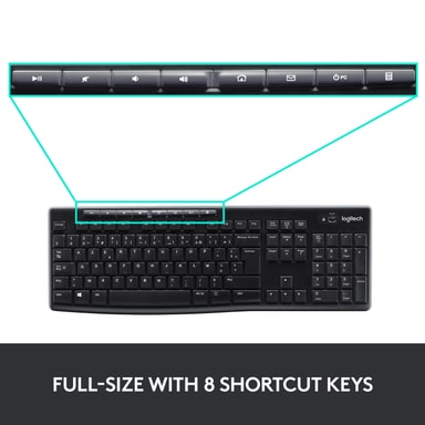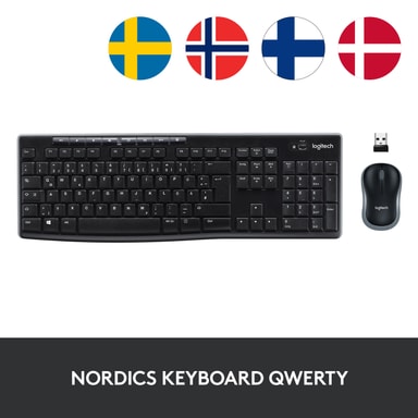 MK270 fra Logitech, giver dig frihed til bevægelse i op til 10 meter med pålidelig forbindelse, takket være den lillebitte, forenende nano-modtager.