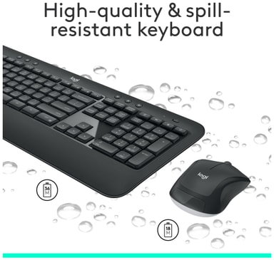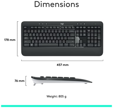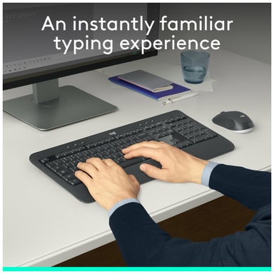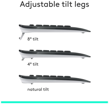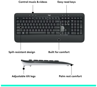 Logitechs design sikrer en ergonomisk form, der aflaster belastning af håndled og sikrer naturlig komfort. Tastaturet understøtter dig med smidig plastik og justerbar bentilt. Musen har en form med kontur samt sidegreb i blødt gummi for at være skridsikker.
