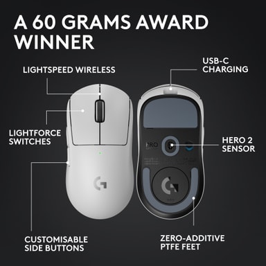 Ingen udjævning eller acceleration, kun rå input med lysets hastighed. Pro er udstyret med den optiske Hero 2 sensor og giver dig præcis kontrol over dit sigte eller dine enheder takket være dens 500+ IPS-sporing, 44.000 DPI-følsomhed samt en responstid på 0,5 ms takket være dens trådløse Lightspeed-forbindelse.