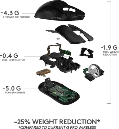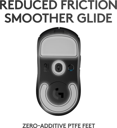 Den trådløse Logitech G Pro X Superlight gaming mus har en fremragende Hero sensor l med op til25.600 DPI opløsning, 400 IPS hastighed,1 ms responstid og den forudgodkendte G Pro-form – men næsten 25 % lettere, med en vægt på lige under 63 gram.