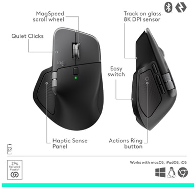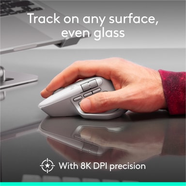 (8) Sammenlignet med MX Master 3 er MX Master 4 90 % mere lydsvag ved klik på venstre og højre knap.