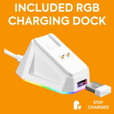 Den medfølgende opladningsdock gør opladningen super nem - når du er færdig med at spille, skal du bare placere den oven på docken. Plus, RGB-belysningen vil give dit spilopsætning et ekstra pift.