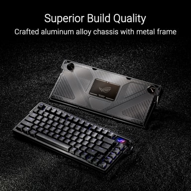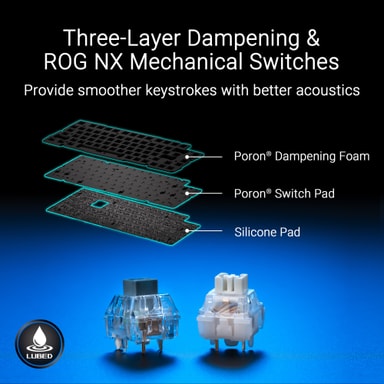 Tastaturet leveres med ROG NX Snow lineære mekaniske switches, som er blevet smurt på forhånd for at give maksimal ydeevne. Du kan også bytte dem direkte til en anden type, så de passer bedst til dine spilbehov. Kontakterne er placeret i en justerbar pakningsmontering og på en tre-lags støjdæmpning, så du fuldt ud kan tilpasse dit gaming gear.