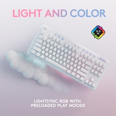 Med dette Logitech G715 Linear trådløse gaming tastatur kan du spille uden begrænsninger. Den inkluderede skyformede håndledsstøtte er lavet af bløde materialer, så dine håndled ligger behageligt. Tastaturet har tilpasselig RBG-belysning.Læs mere om produktet