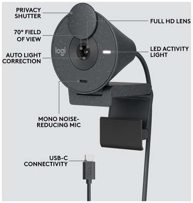 Fremfør skarpe præsentationer, mens du bruger Logitech Brio 300 webkameraet og dets 1080p-videooutput i høj opløsning. Se altid naturlig ud takket være den automatiske lyskorrektion, og bliv hørt takket være den støjreducerende mikrofon. Privatlivslågen sikrer derudover, at du er sikker på alle tidspunkter.