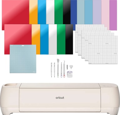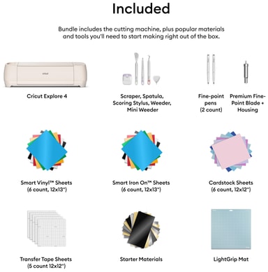 Ud over Cricut Explore 4 basispakken indeholder denne pakke også ekstra materialer og værktøjer, så du kan komme i gang med at lave håndværk med det samme!